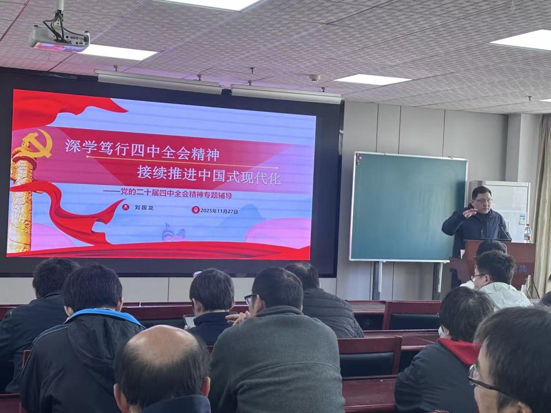 11月27日,古装a片在爱特楼1602报告厅举办学习贯彻党的二十届四中全会精神专题辅导会,马克思主义学院马克思主义中国化系主任刘国龙教授以“深学笃行四中全会精神 接续推进中国式现代化”为题作专题辅导。会议由党委书记张虎主持,古装a片全体教师参加学习。