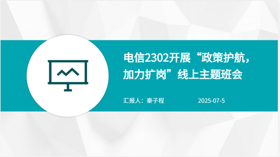 此次线上主题班会的成功举办,为电信2302的同学们搭建了一个了解就业政策、交流就业想法的平台。同学们表示,将以此次班会为契机,充分利用政策优势,提升自身能力,以更加积极的姿态迎接未来的就业挑战,在实现个人价值的同时,为社会贡献自己的力量。