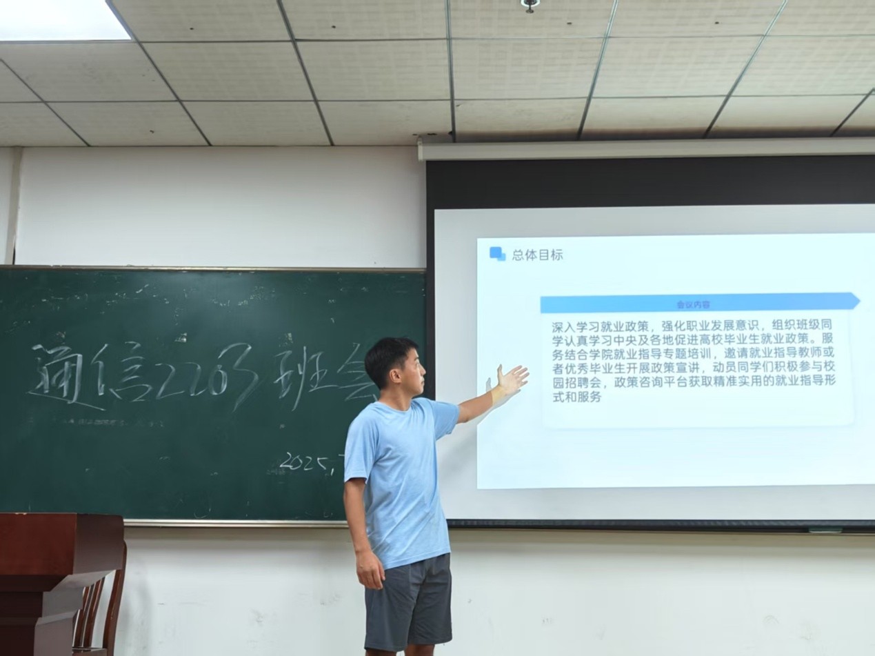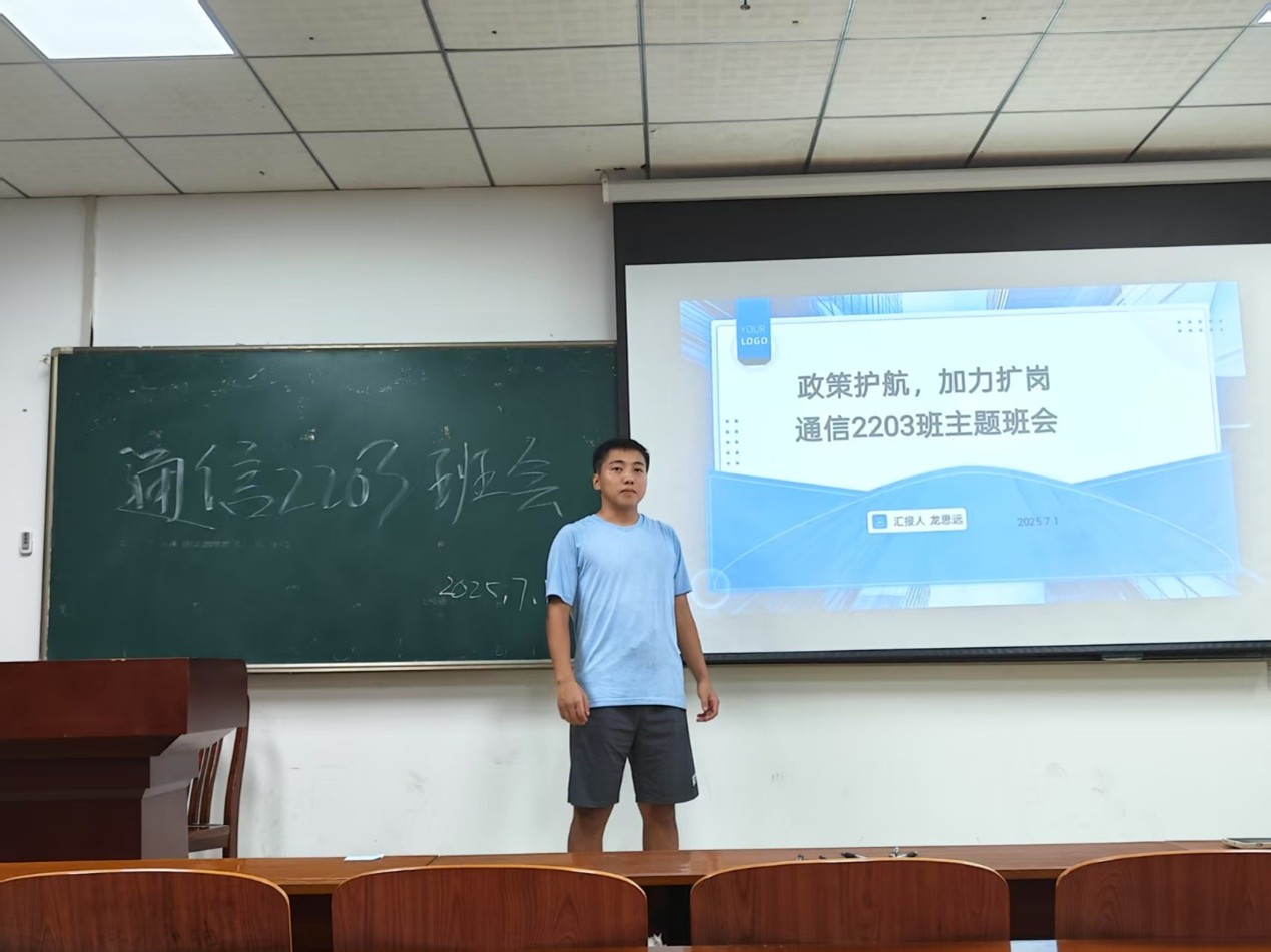 为积极响应国家“稳就业、保民生”的政策号召,帮助班级同学了解就业政策、拓宽就业渠道、提升职业竞争力,为未来职业发展打下坚实基础。通信2203于7月1日在爱特楼101教室开展了一场以“政策护航,加力扩岗”为主题的班会。此次班会由班长龙思远主持,全体同学参加班会。