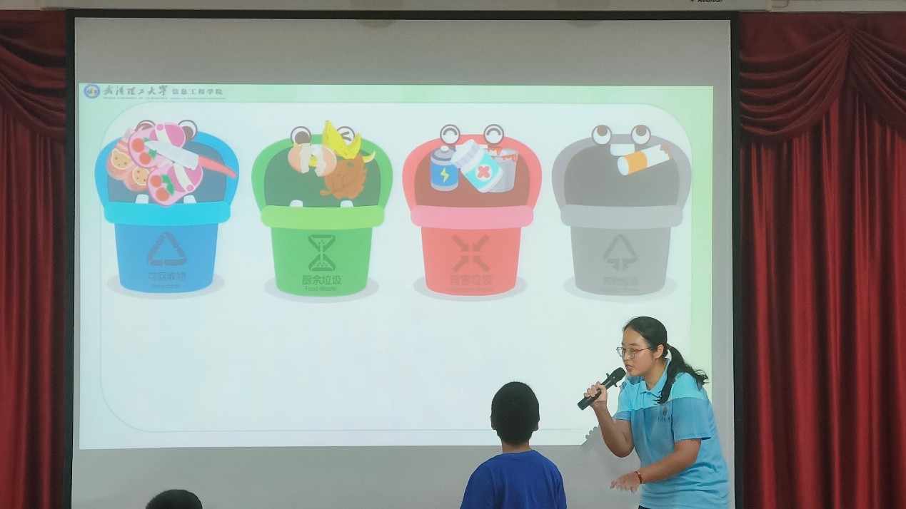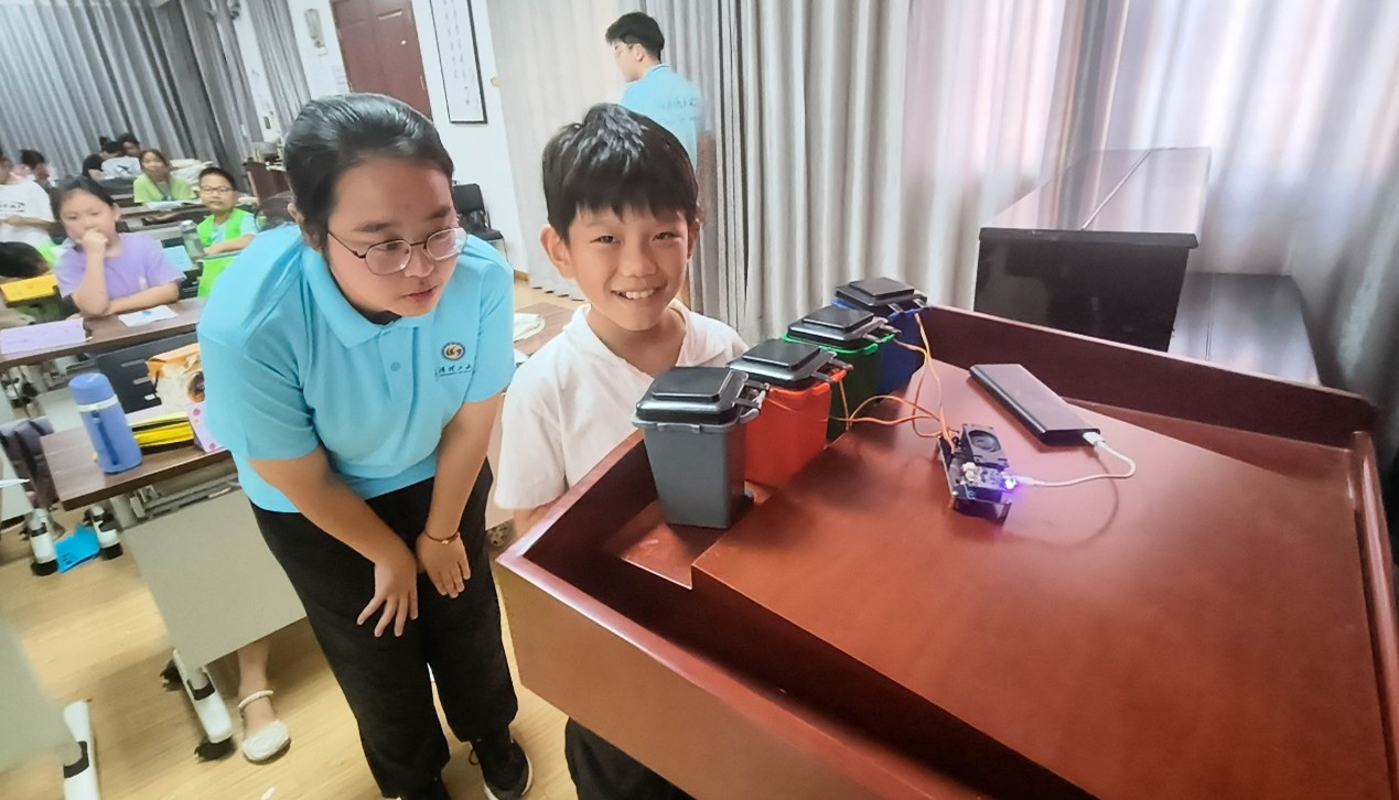 活动的高潮是“环保卫士”智能垃圾桶体验环节。在这一环节中,实践队以AI技术和五育理念为指导,将垃圾分类与现代科技创新性地结合,推出了智能垃圾桶教学模块。这一新颖的教学方式获得了小朋友们的热烈反馈。通过与智能垃圾桶的实时互动,孩子们不仅学到了垃圾分类的相关知识,还在心中埋下了科技创新的种子,激发了他们对未来科技的无限想象与兴趣。