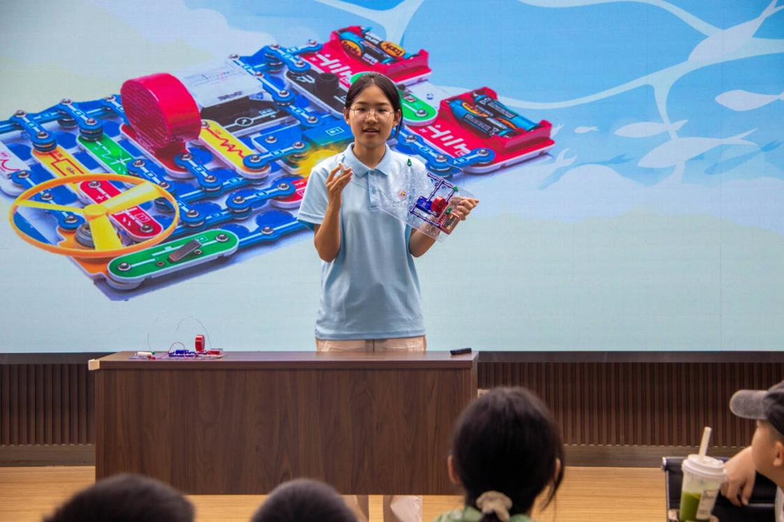 午后的电子积木课程延续了上午的热情。实践队员借助图文、电子积木等教具,先让孩子们认识电阻、开关、导线等元件,再通过“冰糖葫芦串”“树枝分杈”的生动比喻讲解串并联电路。“三步实践法”层层递进:从模仿搭建“按键门铃”熟悉电路连接,到小组合作组装“床头延时灯”掌握元件搭配,最后自由创作“创意电路”。当孩子们发现自己设计的“会发光的电风扇”成功运转时,课堂瞬间变成欢乐的海洋。队员李佳琪说:“看到孩子们为电路‘排障’时专注的眼神,就能感受到科学的种子正在他们心中萌芽。”