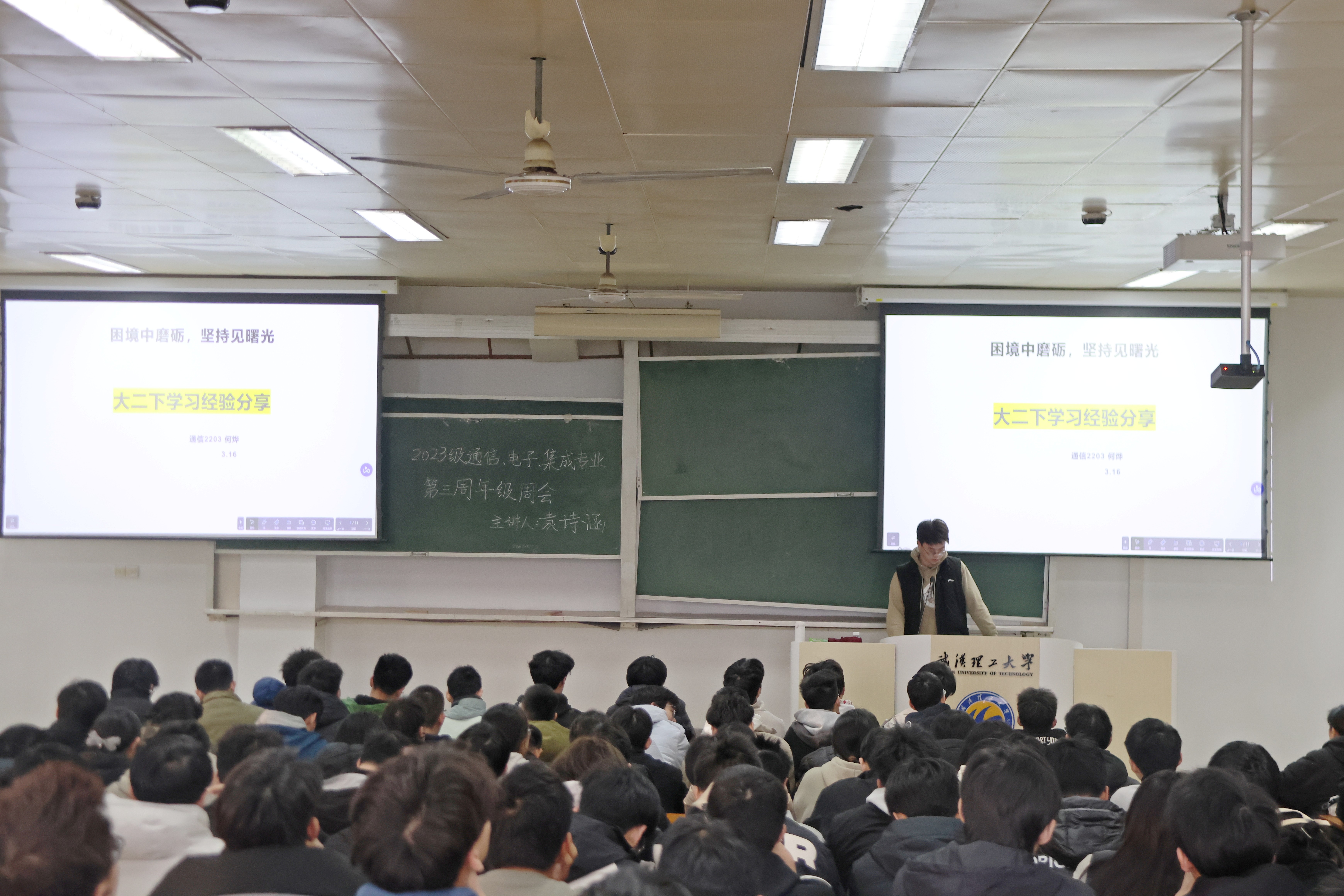 为助力学生提升学业能力,3月16日,古装a片面向2023级本科生举办了以“笃学力行·朋辈引航”为主题的学习经验分享会。本次活动邀请到通信2203的何烨同学担任主讲嘉宾,他以“困境中磨砺,坚持见曙光”为主题,通过经验分享与互动交流,分享大二专业核心课程学习的经验。